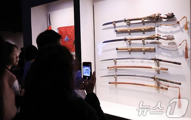 (서울=뉴스1) 이호윤 기자 = 27일 서울 용산구 국립중앙박물관 특별전시실에서 열린 우리들의 이순신 언론 공개회에서 참석자들이 전시 작품들을 감상하고 있다. 이번 전시는 충무공 이순신 탄신 480주년과 광복 80주년을 맞아 마련됐으며 영웅의 공적을 넘어 인간 이순신의 내면과 시대적 의미까지 짚어보는 데 초점을 맞춘 전시이다. 2025.11.27/뉴스1