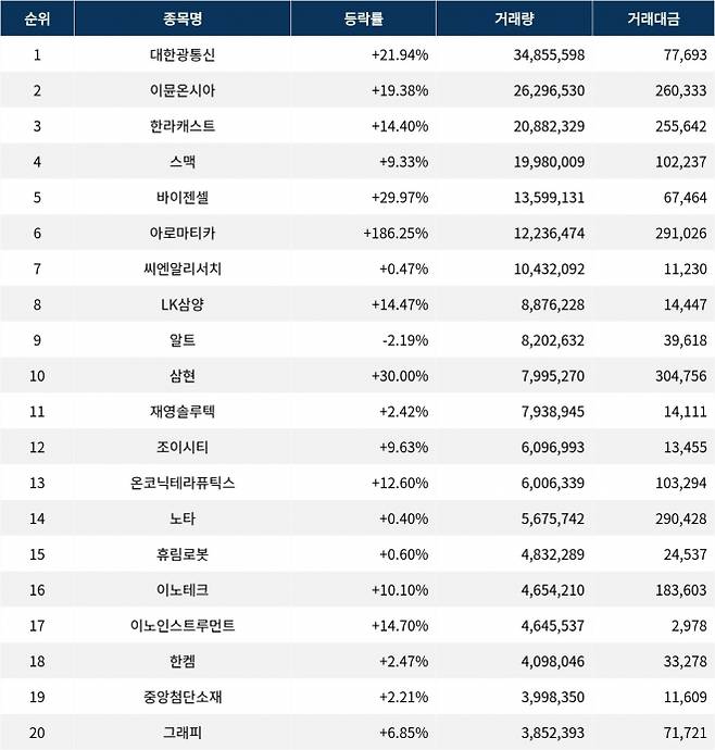 [서울데이터랩]금일 코스닥 거래량 1위 대한광통신, 거래대금 770억 돌파