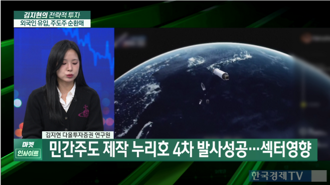 김지현 다올투자증권 연구원은 27일 한국경제TV에 출연해 "누리호 4차 발사 성공에도 관련주의 단기 모멘텀은 어느 정도 소멸된 상태"라며 "프리마켓에서 선반영된 뒤 정규장에서는 차익 실현과 재료 소멸 인식이 겹치며 주가가 약세로 돌아섰다"고 평가했다.