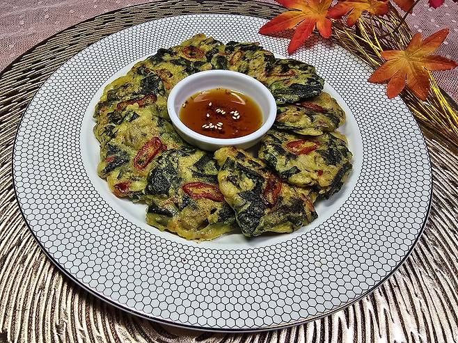 4. 달궈진 팬에 올리브 오일을 두르고 ‘③’의 미역굴전 반죽을 한 스푼씩 떠서 앞뒤로 지진 다음 고추를 얹고 노릇하게 굽는다.