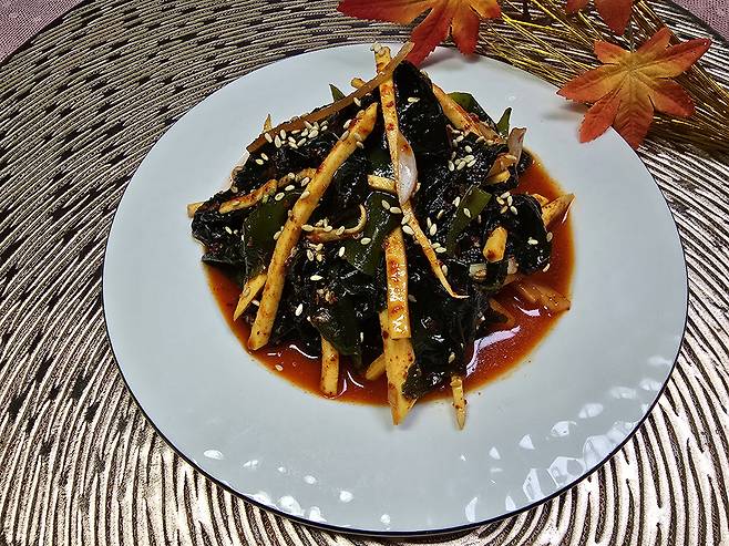 4. 믹싱볼에 ‘①’의 데친 물미역과 ‘②’의 고구마, 양파, 당근을 넣어 혼합 후 ‘③’의 초무침양념장을 넣어 잘 버무려 접시에 담아 통깨를 뿌려 완성한다.
