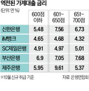 27일 은행연합회의 지난달 은행별 가계대출 금리(신규 취급 기준) 공시에 따르면 신한은행의 신용점수 600점 이하 대출자의 금리는 연 5.48%로 751~800점(연 5.69%)보다 낮았다. 600점 이하는 9월보다 금리가 2.01%포인트 하락했다. iM뱅크(연 4.65%), SC제일은행(연 4.91%), 제주은행(연 5.95%), 부산은행(연 6.9%) 등도 600점 이하가 그보다 높은 등급보다 대출 금리가 낮았다.