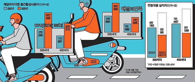 국내 경제 성장이 둔화하고 인공지능(AI)의 파고가 사회 곳곳을 강타하면서 청년 일자리가 쪼그라들자 20·30대 청년세대도 대거 배달 라이더 시장에 뛰어들고 있다. 현재 기업들은 대부분 '신입'보다 '경력' 채용을 우선하다 보니 20대 청년들은 일자리 시장에서 절대적으로 불리한 상황이다. 경제활동의 핵심 연령층인 30대는 최근 '쉬었음' 인구가 무려 33만명에 달해 역대 최대 규모를 기록했다.