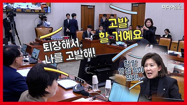 국민의힘과 나경원 의원은 더 강하게 반발하며 여야 사이엔 고성이 오갔다. 그런 와중에 다시 나경원 의원이 “박지원 의원 사과하세요. 어디서 허위 사실을 마음대로 말합니까? 박지원 의원. 나이 그 정도 드시고, 선수가 그 정도 됐으면 할 말 안 할 말, 말조심하세요. 어디서 그렇게 아무 말이나 합니까?”라고 책상을 치며 고성을 질렀다. 그러자 박 의원도 “퇴장해! 위원장이 퇴장하라 했으니까, 퇴장해. 퇴장해서, 나를 고발해!”라고 소리 질렀다. 영상엔 박지원 의원과 나경원 의원이 서로 삿대질하며 충돌하는 역대급 장면이 생생하게 담겼다.