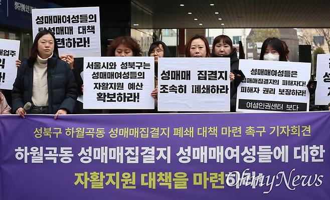 | ▲ "하월곡동 성매매집결지 폐쇄, 성매매여성 자활지원 대책 촉구" 성매매문제해결을위한전국연대가 2023년 12월 6일 오전 서울 성북구 성북구청 앞에서 '성북구 하월곡동 성매매집결지 폐쇄 대책 마련 촉구 기자회견' 기자회견을 열고 있다. 참석자들은 "하월곡동 성매매집결지(속칭 미아리 텍사스) 폐쇄 및 이주를 앞두고 업주들의 개발 이익을 둘러싼 갈등 속에 성매매여성들은 오히려 더욱 취약한 상황에 내몰리고 있다"며 "성매매여성에 대한 자활지원 대책 수립과 실행, 성매매집결지 건물주와 업주에 대한 조사 및 처벌, 불법이익 몰수 및 추징" 등을 촉구했다. |