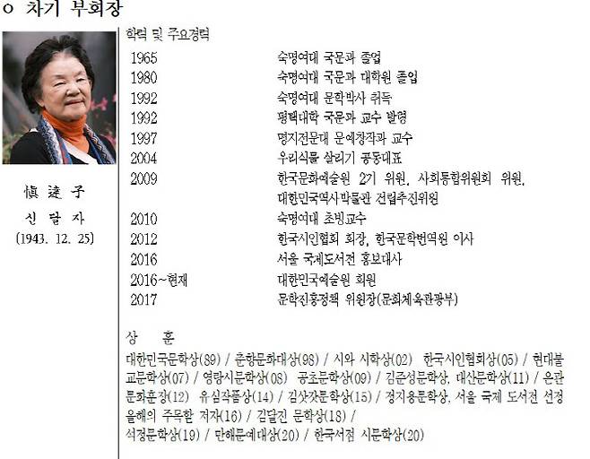 신달자 차기 부회장은 1964년 ‘환상의 밤’으로 등단한 이후 ‘백치 애인’, ‘겨울축제’, ‘모순의 방’ 등 다수의 저서를 출간했다. 대한민국문학상, 만해대상 등 문학상을 수상하는 등 2012년 은관문화훈장을 수훈했다. 2016년부터 예술원 회원으로 활동 중이다.