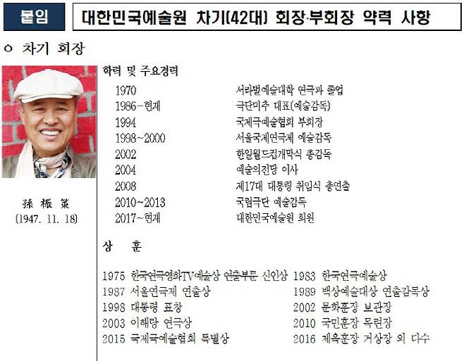손진책 차기 회장은 극단 미추 대표로서 1974년 연극 ‘서울말뚝이’로 데뷔했다. 마당극 ‘허생전’, 창극 ‘윤봉길 의사’, 오페라 ‘투란토트’ 등 다수의 작품을 연출했다. 2002년에는 한일월드컵개막식 총감독, 2004년 예술의전당 이사, 2010년 국립극단 예술 감독 등을 역임했으며, 2003년 이해랑 연극상, 2010년 국민훈장 목련장을 수훈했다. 2017년부터는 예술원 회원으로 활동하고 있다.