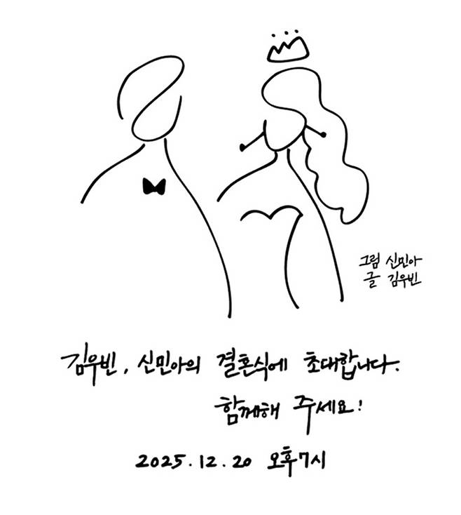 공개된 청첩장에는 '그림 신민아 글 김우빈'이라는 글과 함께 신랑, 신부의 모습이 그림으로 표현돼있다.
