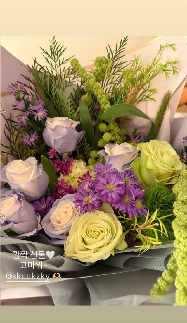 송혜교는 27일 자신의 SNS를 통해 “깜짝 선물 고마워~”라는 글과 함께 한 다발의 꽃 사진을 남겼다. 촬영된 꽃다발은 연보라·라임 컬러 장미와 퍼플빛 소국이 조화된 풍성한 구성으로, 수지가 직접 준비해 보낸 것으로 알려졌다.