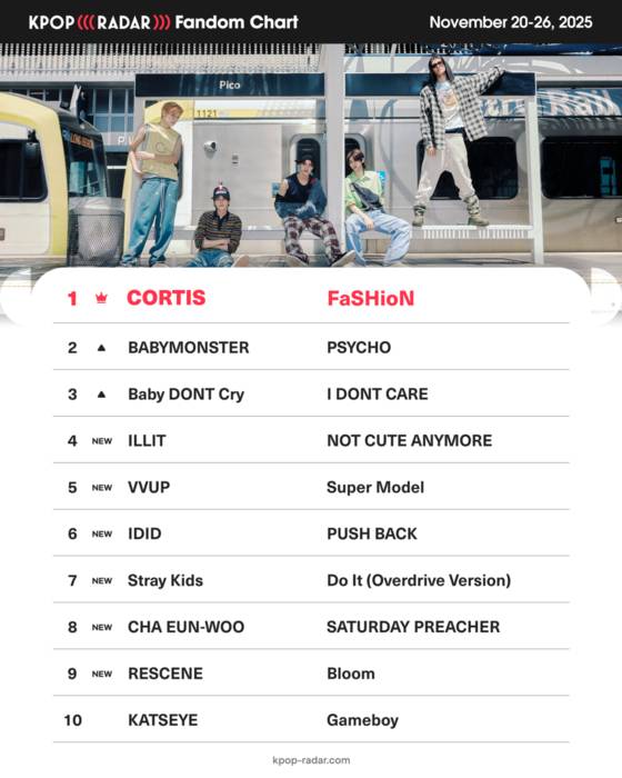 위클리 팬덤 차트는 한 주간 팬덤 지표가 가장 크게 성장한 아티스트를 증감률 기준으로 순위를 매기는 차트로, 11월 4주차(집계 기간 2025년 11월 20일~11월 26일) 차트에서 코르티스는 지난 9월 발매한 '패션(FaSHioN)'으로 정상에 복귀했다.