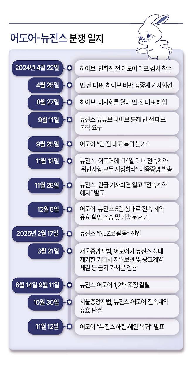 ![걸그룹 뉴진스가 1년간의 전속계약 분쟁 끝에 소속사 복귀 의사를 밝히면서 양측이 새로운 분수령을 맞았다. 사진은 하니(왼쪽부터), 민지, 혜인, 해린, 다니엘 등 뉴진스 멤버들이 지난 3월 서울 서초구 서울중앙지방법원에서 열린 ‘기획사 지위보전 및 광고계약 체결 등 금지’ 가처분 심문기일을 마친 후 취재진의 질문에 답변하는 모습. [연합]](https://img2.daumcdn.net/thumb/R658x0.q70/?fname=https://t1.daumcdn.net/news/202511/28/ned/20251128113152582ilav.jpg)