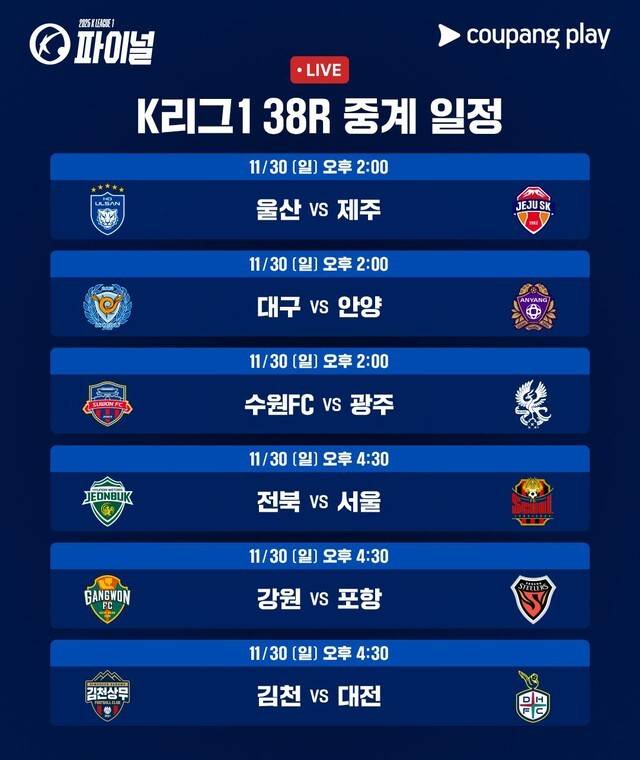 이미 조기우승을 확정한 1위 전북현대와 4위 포항스틸러스를 제외한 모든 순위가 일요일 하루 만에 결정되며, 강등·잔류·상위권·ACL 티켓·준우승까지 전 구역에서 사활이 걸린 승부가 펼쳐질 예정이다.