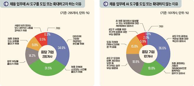 인공지능 채용을 도입·확대할 계획이 있는 기업은 74.5%(295곳)에 이른다. 이들은 인적성·역량검사(67.5%), 지원 서류 검토(63.4%), 채용 절차 관리(55.6%) 등에 인공지능을 활용하겠다고 응답했다. 그 사유로는 데이터에 기반한 객관적인 판단을 위해(34.6%), 채용 전형에 소요되는 시간을 줄이기 위해(31.5%), 업무 부담을 줄이기 위해(14.2%) 순으로 나타났다.