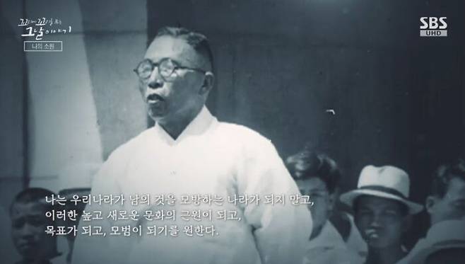 "나의 소원, 내가 원하는 우리나라. 오직 한없이 가지고 싶은 것은 높은 문화의 힘이다. 문화의 힘은 우리 자신을 행복하게 하고 나아가서 남에게 행복을 주기 때문이다. 나는 우리나라가 남의 것을 모방하는 나라가 되지 말고 이러한 높고 새로운 문화의 근원이 되고 목표가 되고 모범이 되기를 원한다. 그래서 진정한 세계의 평화가 우리나라에서, 우리로 말미암아 세계에 실현되기를 원한다."
