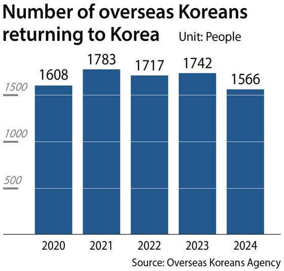 A total of 1,566 Koreans returned permanently to Korea last year, according to the Overseas Koreans Agency (OKA). Over the past five years, an average of 1,683 overseas Koreans have returned annually. Of those who returned last year, 881 were aged 60 or older — more than 56 percent of the total.