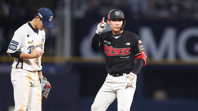 ▲ 지난 23년 11월 2일 경남 창원NC파크에서 열린 2023 신한은행 SOL KBO리그 플레이오프 3차전 kt wiz와 NC 다이노스의 경기. 9회 초 2사 주자가 없는 상황 kt 7번 송민섭이 안타를 치고 손짓하고 있다.