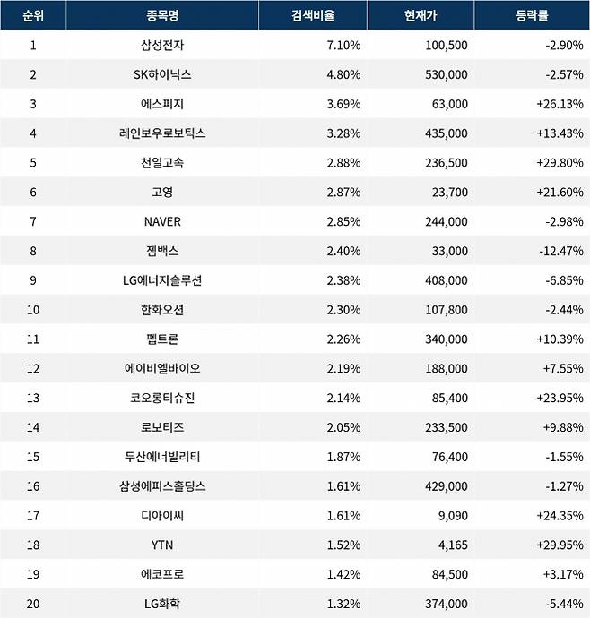 이어 검색비율 2위의 SK하이닉스(000660)는 등락률 -2.57%로 하락 마감했다. 검색비율 3위의 에스피지(058610)는 26.13% 폭등 마감했다. 검색비율 4위 레인보우로보틱스(277810)는 13.43%의 급등세를 보였다. 검색비율 5위 천일고속(000650)은 29.8%로 상한가를 기록했다.