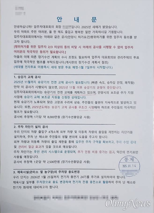 비대위와 아파트 관리 사무소 등에 따르면 입주자 대표회의는 지난 1월 "2025년 11월까지 승강기 전면 교체 공사가 필요하다"며 '행위 허가'를 위한 주민 동의를 구했고, 전자투표 결과 2/3 찬성으로 가결됐다.