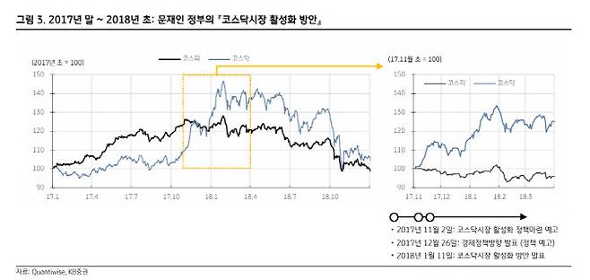 2017년 11월 2일 정책 예고 시점부터 코스닥 지수가 급등하기 시작해 다음해 1월 11일 정책 실제 발표 이후로도 3주간 더 상승한 만큼, 현 시점이 이때와 같다고 본다면 이날 급등에도 불구하고 매수 대응하는 것이 적절하다는 설명이다.