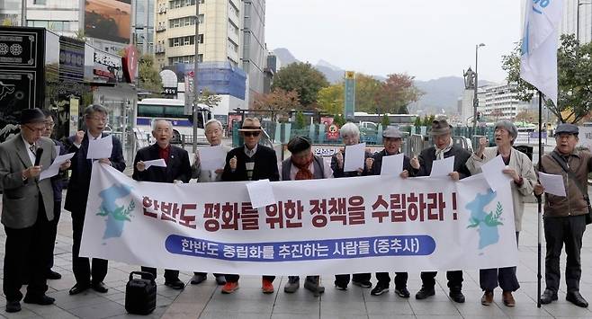 | ▲ 한반도 중립화를 추진하는 사람들 소속 주요 원로 인사들이 지난해 11월 1일 광화문 동화면세점 앞에서 한반도 평화 시국선언문을 발표했다. |