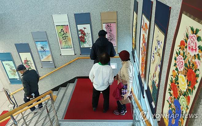 (부산=연합뉴스) 강선배 기자 = 부산 동래구 충렬사 안락서원 교육회관의 2025 수강생 솜씨자랑발표회가 열린 28일 교육회관 계단 주변에 수강생들의 민화, 서예, 수묵화, 사진 등이 전시돼 방문객들이 감상하고 있다. 2025.11.28