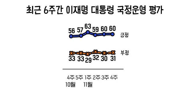 이재명 대통령 국정운영 평가는 '긍정 60%'로 지난주와 동일합니다. 부정 평가는 지난주보다 1%포인트 오른 31%입니다. 최근 6주간 흐름을 보면, 긍정 평가는 60% 전후를 유지하고 있는 상황입니다. 긍정 평가 이유도 외교 43%(지난주보다 9%포인트 상승)가 압도적 1위입니다. 한미 관세 협상, APEC 정상회담 등 외교적 성과를 바탕으로 안정적인 국정운영 지지도가 이어지는 상황이라고 할 수 있겠습니다.