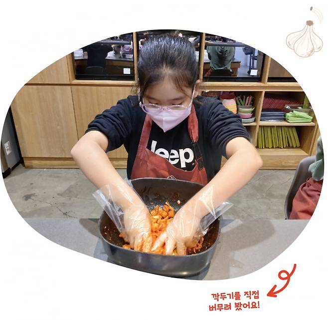 배추김치, 깍두기, 동치미 등을 직접 담가 보는 체험 활동도 할 수 있다. 깍두기를 담그고, 김치의 역사를 배우고, 김치를 먹어 보기도 하며 우리 고유의 음식 김치와 김장 문화의 가치를 새롭게 생각해 보는 시간이었다.