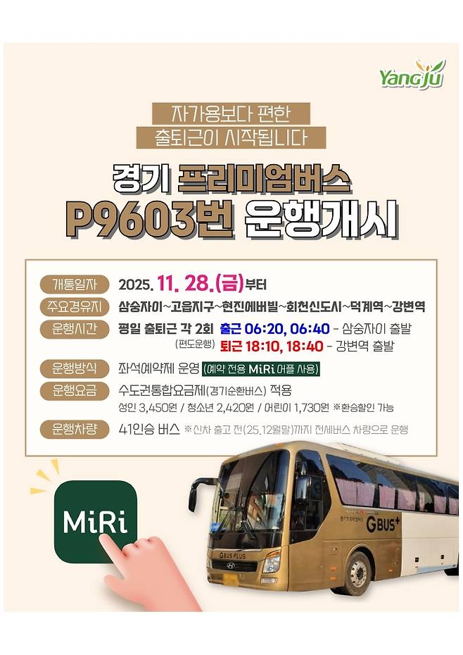 양주시(시장 강수현)는 삼숭자이에서 서울 강변역까지 운행하는 경기프리미엄 버스 P9603번이 28일부터 본격 운행을 시작했다고 밝혔다.
