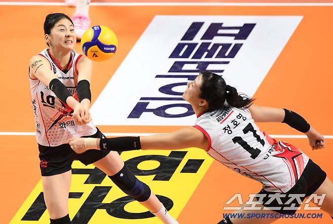 28일 서울 장충체육관에서 열린 V리그 GS칼텍스-정관장전. 정관장 박혜민과 정호영이 공을 살려내고 있다. 장충체=정재근 기자 cjg@sportschosun.com/2025.11.28/