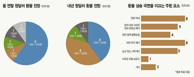 원달러 환율 1400원대의 뉴노멀 여부를 묻는 질문엔 9명 중 6명이 ‘그렇다’고 답했다. 조병현 다올투자증권 투자전략팀장은 “고환율은 추세로 자리 잡았다고 판단한다”며 “국내 금융 시장과 산업계로 투자 순유입 규모에 비해 외부 유출 규모가 상대적으로 커지고 있다”고 말했다. 그러면서 “재정지출을 포함한 통화량의 증가 속도가 여타 국가 대비 가속화됐다는 점도 상대적 통화 가치 약세 구간을 지지하는 요인”이라고 설명했다.