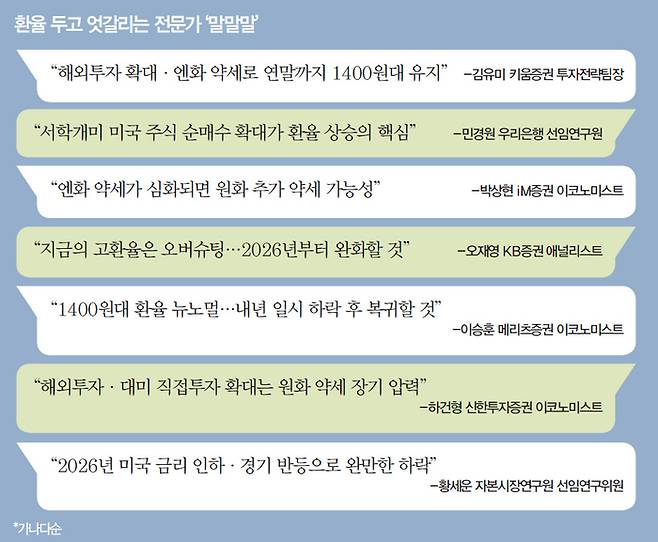 반반 의견도 있다. 중장기적으로 완만한 하락세를 보일 것이란 전망이다. 황세운 자본시장연구원 선임연구위원은 “1400원대 환율은 장기적으로 유지되기 어렵다”며 “2026년 1분기까지는 1400원대가 지속될 수 있지만 이후 완만한 하락을 예상한다”고 말했다.
