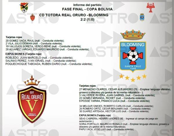 선수 11명 포함 총 17명이 서로를 향해 주먹을 휘두르는 등 폭력 행위로 레드카드를 받았다. 볼리비아 축구 역사상 최악의 폭력 상태로 기록될 사건이다.
