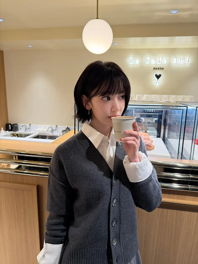 실내 사진에서는 같은 착장에 따뜻한 조명의 카페를 배경으로, 두 손으로 컵을 감싼 채 따뜻한 음료를 들이키는 모습이 담겼다.