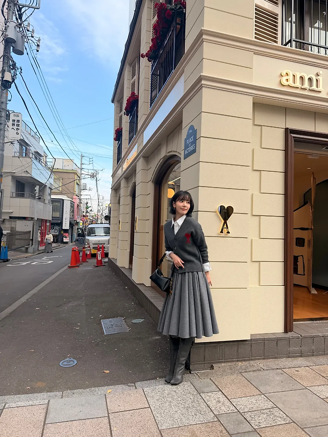 사진 속에서 사쿠라는 짙은 그레이 컬러의 가디건과 화이트 셔츠, 풍성한 주름이 잡힌 플레어 스커트를 매치해 마치 프렌치 스쿨룩을 연상시키는 스타일을 완성했다.