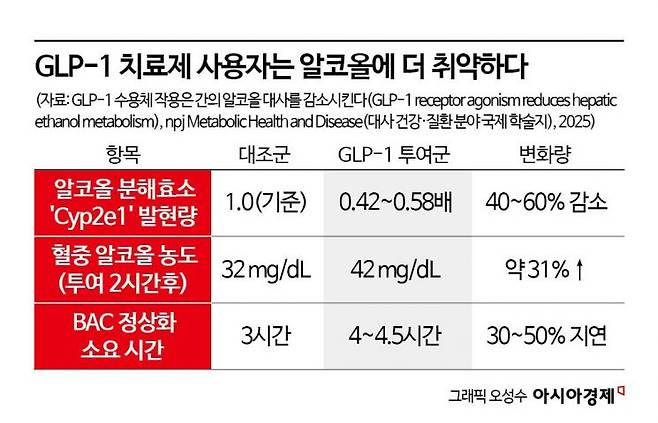 GLP-1 치료제 사용자는 알코올 대사 속도가 더 느려진다는 점도 문제다. 예일대 의대 연구팀에 따르면 GLP-1 계열 약물이 간의 알코올 분해 효소인 'Cyp2e1' 발현을 평균 40~60% 감소시키는 것으로 나타났다. 이로 인해 동일한 양의 알코올을 투여해도 GLP-1 투여군의 혈중 알코올 농도는 대조군보다 20~30% 더 높게 유지됐으며, 알코올 농도가 정상으로 떨어지는 데 걸리는 시간도 30~50%가량 길어졌다. 연구진은 이를 통해 GLP-1 약물이 알코올 대사를 늦춰 '적은 양으로 더 오래 취하는 현상'이 발생할 수 있다고 설명했다.