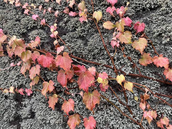 차가 시멘트 벽을 힘겹게 붙잡고 있는 것은 아닐까, 겨울을 대비한 작은 몸부림은 아닐까 하는 생각을 하다 보면 담쟁이덩굴의 생명력이 더 크게 느껴집니다. 덩굴식물의 생존 방식은 다양하지만, 담쟁이덩굴은 독특한 흡착근을 이용해 자신만의 전략으로 하루하루를 견뎌내는 식물입니다.
