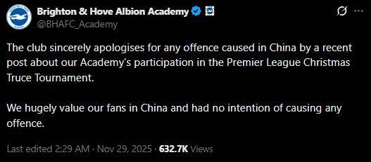 영국 매체 '더 선'은 29일(한국시간) "브라이턴이 한 장의 SNS 게시물로 인해 중국 정부와 팬들에게 공식적으로 사과해야 하는 처지에 놓였다"고 전했다.