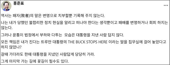홍 전 시장은 29일 SNS에서 “갈 때 가더라도 대통령을 지냈던 사람답게 당당히 가라”고 적었습니다.