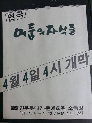 | ▲ '문예진흥원 소극장'(현 아르코 예술극장) 오픈 기념(1981 4.4~12) 연극 포스터 <어둠의 자식들> (원작:이동철 작:황석영 집필:오종우 이상우 김광림 홍성기 연출:이상우 출연: 문성웅 엄경환 김경원 김보현 김애영 박인배 이문수 등, 무대감독:홍성기 음향:류종숙 미술:박광수 진행:이은식 소품:전진희 의상:권혜숙 조명:김의중 편집:전시경)에 출연해 연기 실력을 다졌던 고 이문수 배우 |