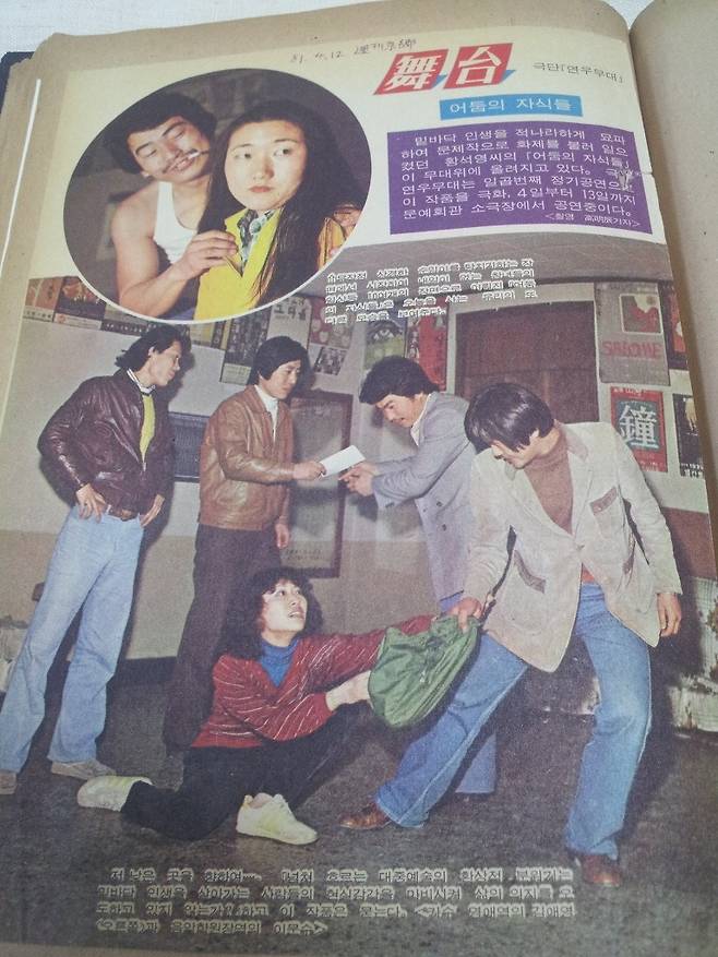| ▲ 주간지 ‘선데이 서울’ (1981 4 12)에 실린 연극홍보기사 연극 ‘어둠의 자식들’에서 여배우 김경원(빨간 상의)이 카수영애를 연기하고 있다. 콧수염에 담배를 피워물고 있는 배우가 고 이문수. 봉투를 건네받고 있는 이는 세종문화회관 사장을 했던 고 박인배이다. |