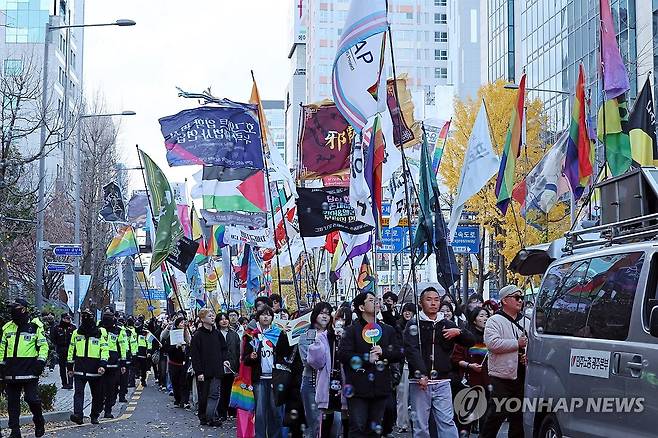 (광주=연합뉴스) 김혜인 기자 = 29일 광주 동구 금남로 일대에서 광주퀴어문화축제 참석자들이 거리 행진을 하고 있다. 2025.11.29