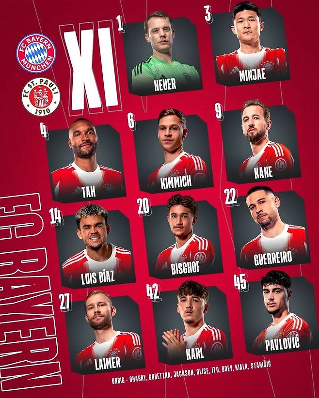 이날 뮌헨은 해리 케인을 필두로 루이스 디아스, 라파엘 게레이로, 레나르트 칼, 알렉산다르 파블로비치, 조슈아 키미히, 톰 비쇼프, 조나단 타, 김민재, 콘라트 라이머, 골키퍼 마누엘 노이어가 선발 출격했다.