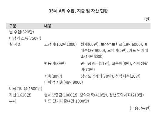 35세 A씨 월 수입은 320만원이다. 연간 비정기 수입은 750만원이 들어온다. 월 지출은 271만1000원이다. 고정비가 월세(60만원), 보장성보험료(19만6000원), 휴대폰(2만9000원), 모임비(5만원), 카드 단기대출(14만6000원) 등 102만1000원이다. 변동비는 관리공과금(11만원), 교통비(8만원), 식비·생활비(70만원) 등 89만원이다. 저축은 청년도약계좌(70만원), 청약저축(10만원) 등 총 80만원씩 하고 있다. 미파악 지출은 48만9000원이다. 연간 비정기 비용은 1500만원이다. 자산은 월세보증금(1000만원), 청약저축(410만원), 청년도약계좌(210만원) 등 1620만원이 있다. 부채는 카드 단기대출 4건을 받아 총 1000만원이 있다.