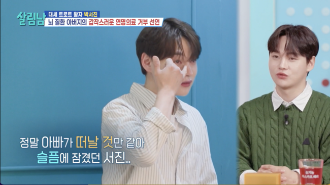 [OSEN=박근희 기자] '살림하는 남자들 시즌2’ 가수 박서진이 뇌 질환으로 쓰러졌던 아버지의 충격적인 연명치료 거부 발언에 감정을 숨기지 못했다.