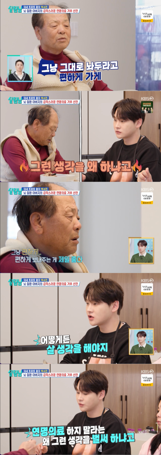 '살림하는 남자들 시즌2' 가수 박서진이 뇌 질환으로 쓰러졌던 아버지의 충격적인 연명치료 거부 발언에 감정을 숨기지 못했다.