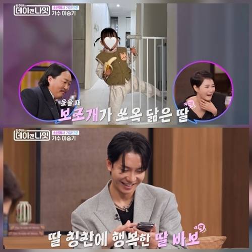 이승기는 휴대폰 배경화면을 직접 꺼내 보이며 "웃을 때 저랑 똑같은 게 있다"며 딸의 보조개를 자랑했다.