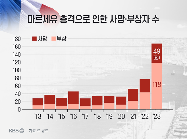 프랑스 남쪽에 위치한 마르세유는 지중해 항구 도시라는 지리적 조건 때문에 마약 밀매와 갱단 활동에 취약한 지역 중 하나로 오랫동안 지목돼 왔습니다. 마약 범죄로 한때 일주일에 한 명꼴로 살해되기도 했습니다. 2023년 한 해 동안 49명이 숨졌는데 대부분 총격으로 숨졌습니다. 도시 한복판에서 마약 갱단간 전쟁이 벌어지는가 하면, 갱단이 지역사회를 통제하는 상황까지 벌어졌습니다.