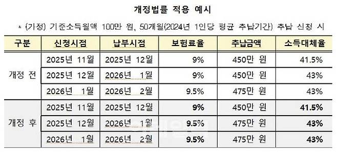 추납보험료 산정기준을 변경하지 않을 경우 올해 12월에 추납 신청해 내년 1월(납부기한은 신청월의 다음달 말일인 2026년 1월 31일)에 납부하면 추납보험료는 인상 전 보험료율인 9%를 적용 받습니다.
