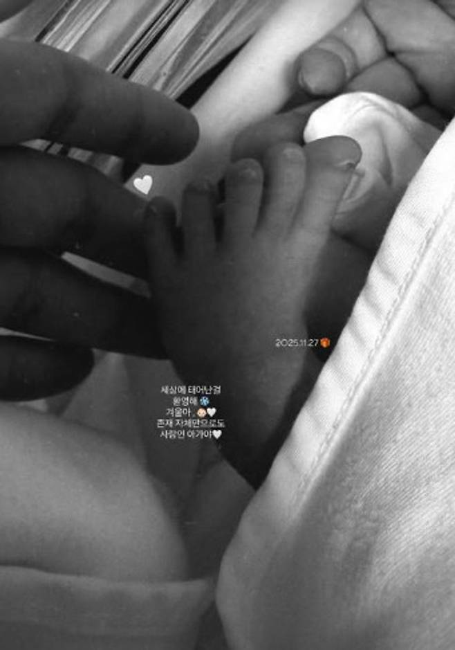 유나는 30일 자신의 소셜 계정을 통해 “2025. 11. 27. 세상에 태어난 걸 환영해. 겨울아. 존재 자체만으로도 사랑인 아가야”라는 글을 올리며 2세 탄생을 알렸다 함께 공개된 사진에는 아기의 발 모습이 담겨있다.