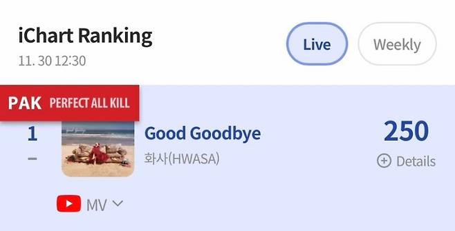 화사가 'Good Goodbye'로 올해 솔로 여가수 가운데 가장 먼저 '퍼펙트 올킬'(PAK) 주인공이 됐다.